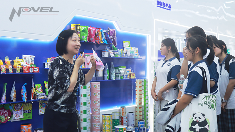 座談結束,在工作人員的帶領下,研學團隊先后參觀了永新股份展廳和MES系統控制中心。展廳內,各品類包裝產品、高性能薄膜琳瑯滿目,從食品包裝到工業應用,從環保材料到智能包裝,工作人員詳細介紹了產品的研發過程、性能特點及應用領域,讓同學們直觀感受到包裝材料的多樣“膜”力。MES系統控制中心內,永新股份信息部經理王健與同學們進行互動問答,現代化的智能管理界面實時呈現著生產全流程數據,同學們紛紛感嘆工業智能化帶來的高效與精準。